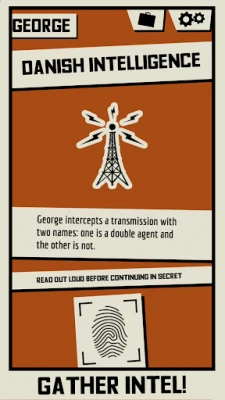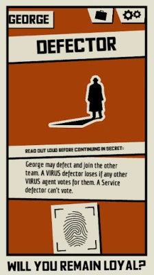 Pass the device around as you get events that can reveal information about other players, change your team, or give you a completely new win condition. Information is revealed secretly and it is up to each player how much they reveal. As a VIRUS double agent, this is your opportunity to sow doubt about other players. As a Service agent, you need to be careful not to reveal anything that the VIRUS might use against you. At the end of the game each player votes on who to imprison. If a double agent is imprisoned, the Service wins. Otherwise VIRUS does.
